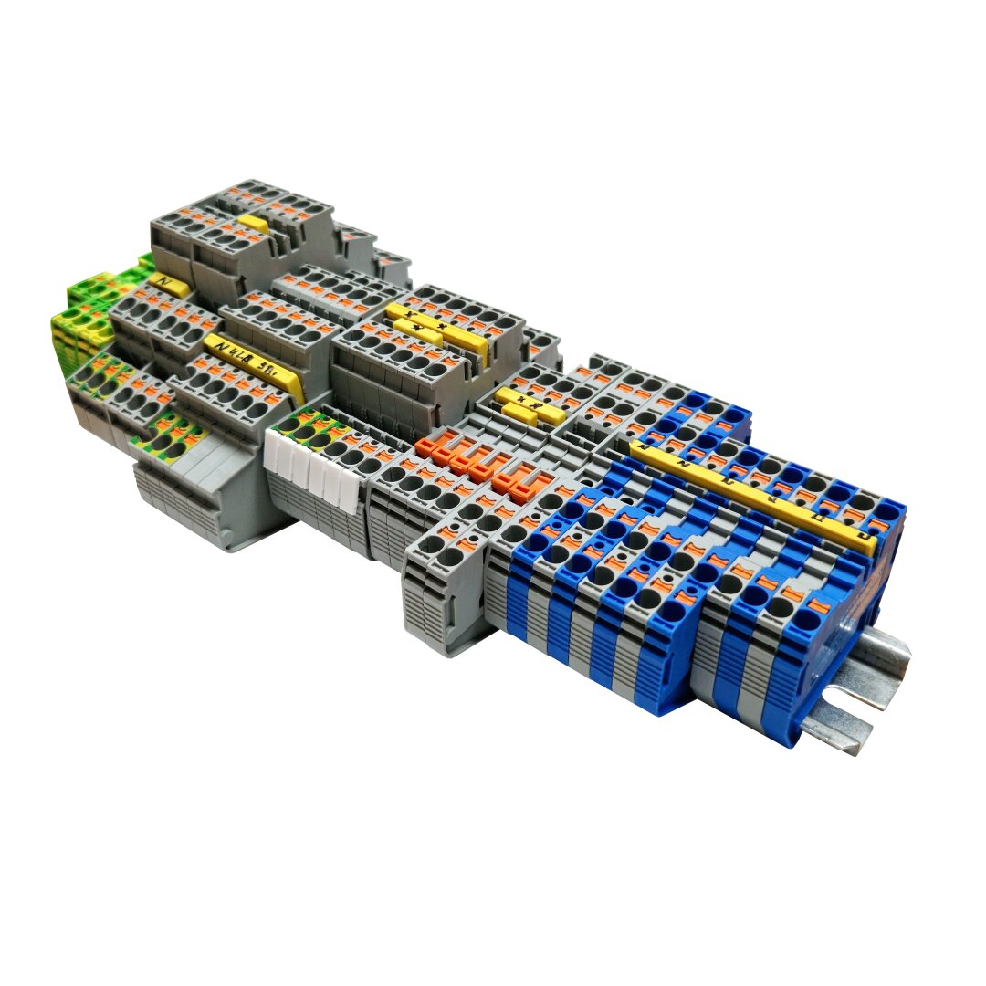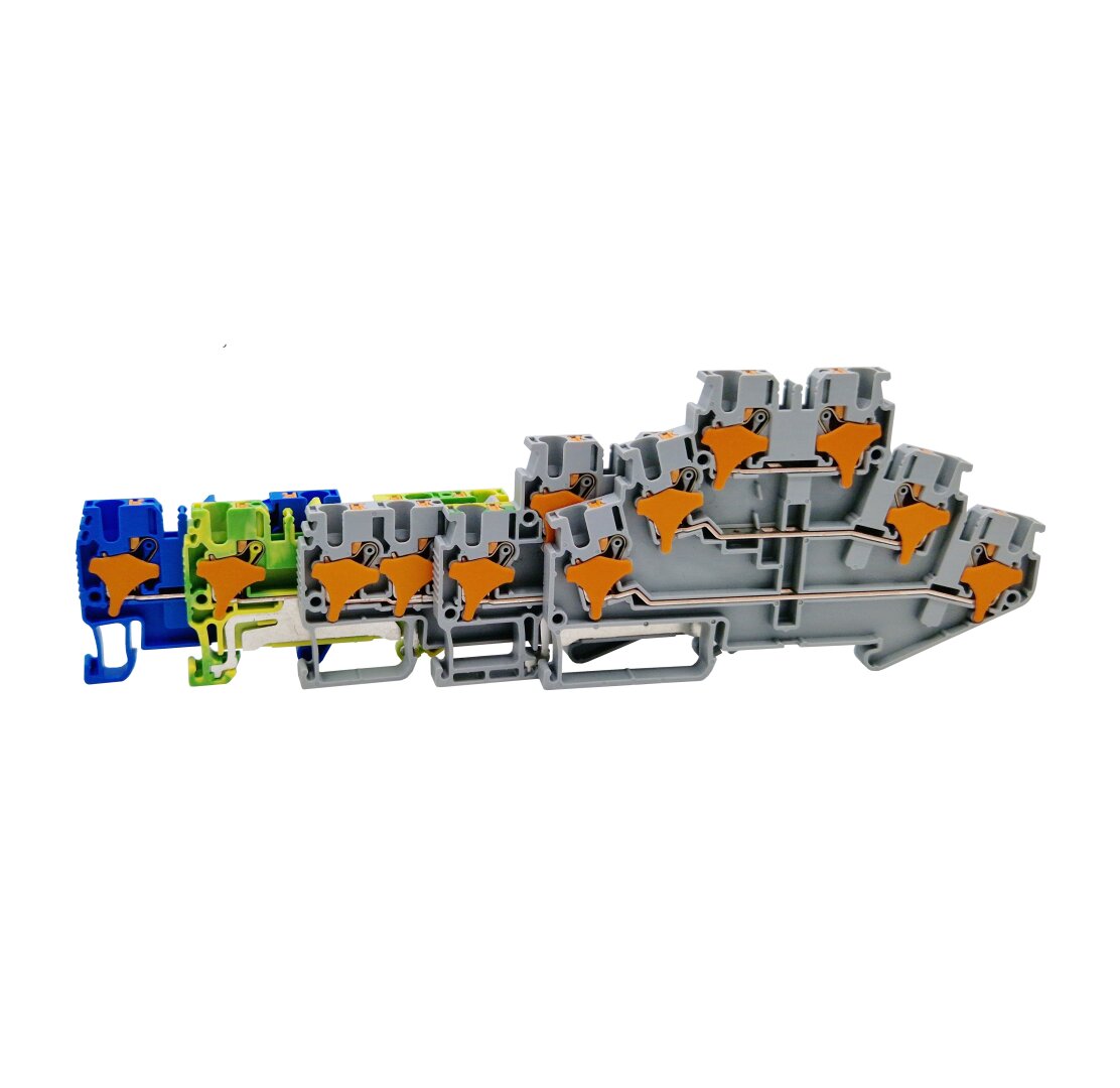 Patrové svorky PS s push-in technologií. Oranžové tlačítko umožňuje rychlé a bezpečné odpojení vodiče bez rizika poškození svorky. Dvou nebo třípatrové svorky, dostupné i v provedení se spodním patrem s funkcí PE (spodní patro je vodivě spojeno s TH lištou). Průřez vodiče 0,08 ÷ 4 mm².